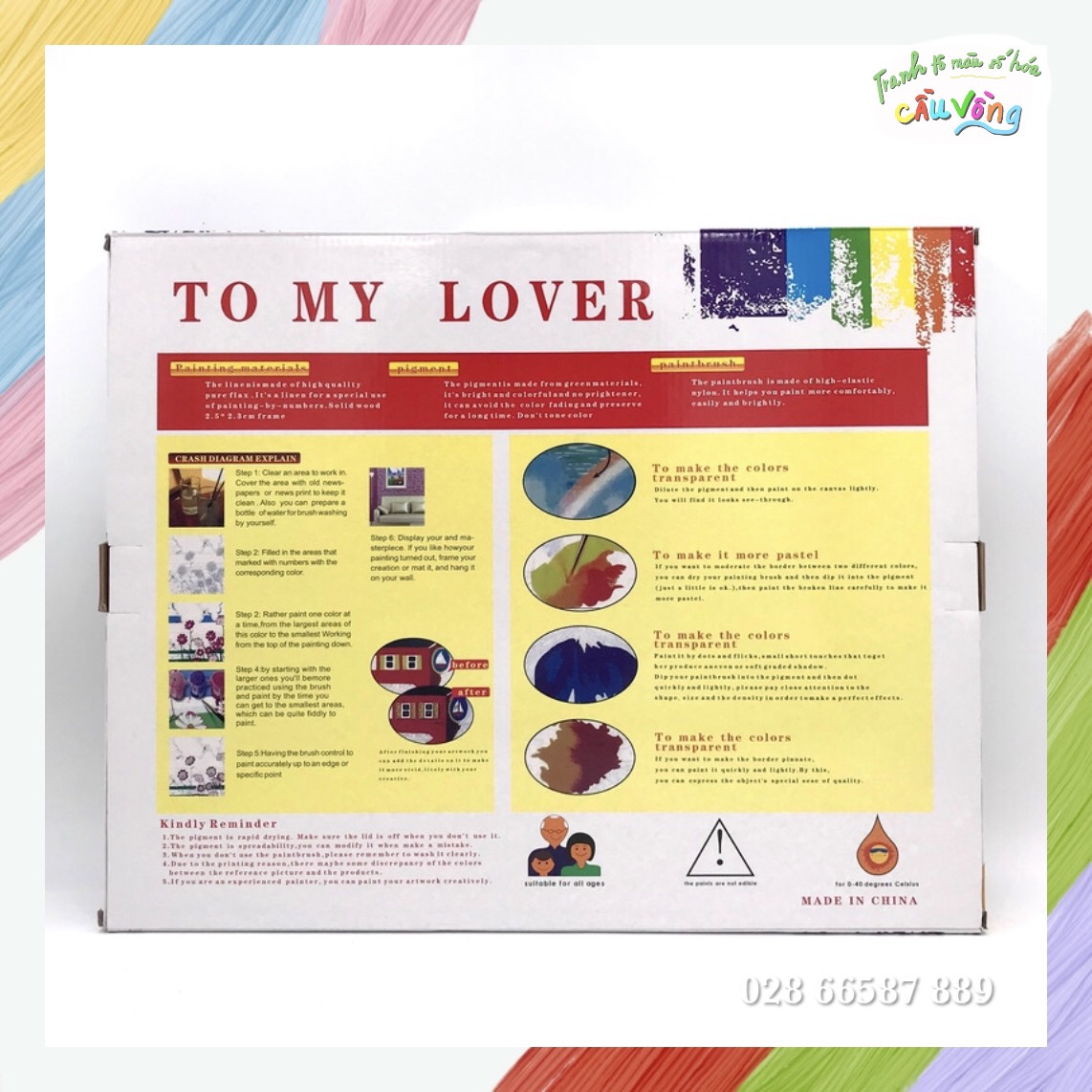 -Bộ màu vẽ có đánh số: Các lọ màu vẽ được đánh số tương ứng với số được đánh trên tranh, có chất lượng cao cấp và màu sắc rực rỡ, độ bền màu cao, an toàn cho sức khỏe người dùng.