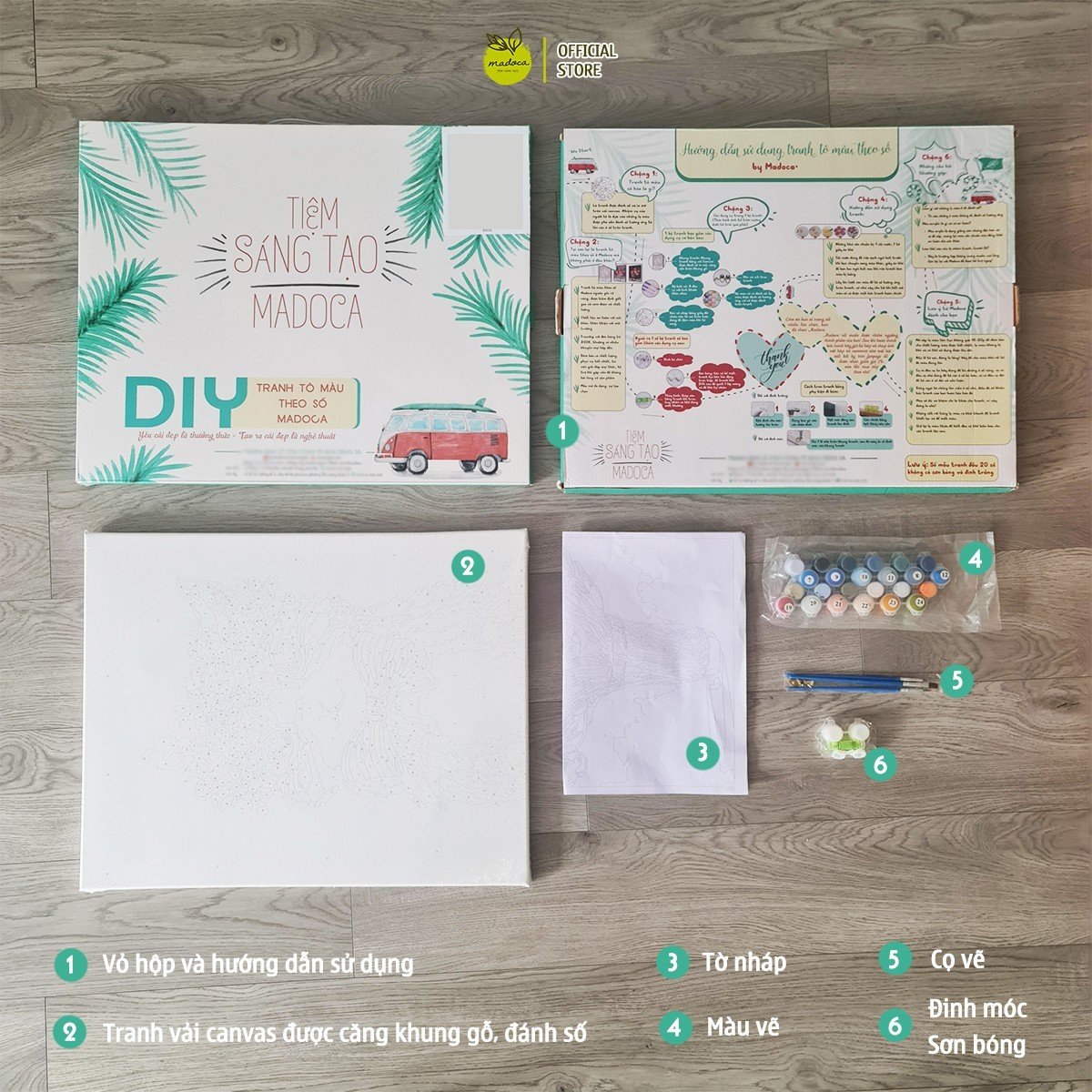 -Bộ màu vẽ có đánh số: Các lọ màu vẽ được đánh số tương ứng với số được đánh trên tranh, có chất lượng cao cấp và màu sắc rực rỡ, độ bền màu cao, an toàn cho sức khỏe người dùng.