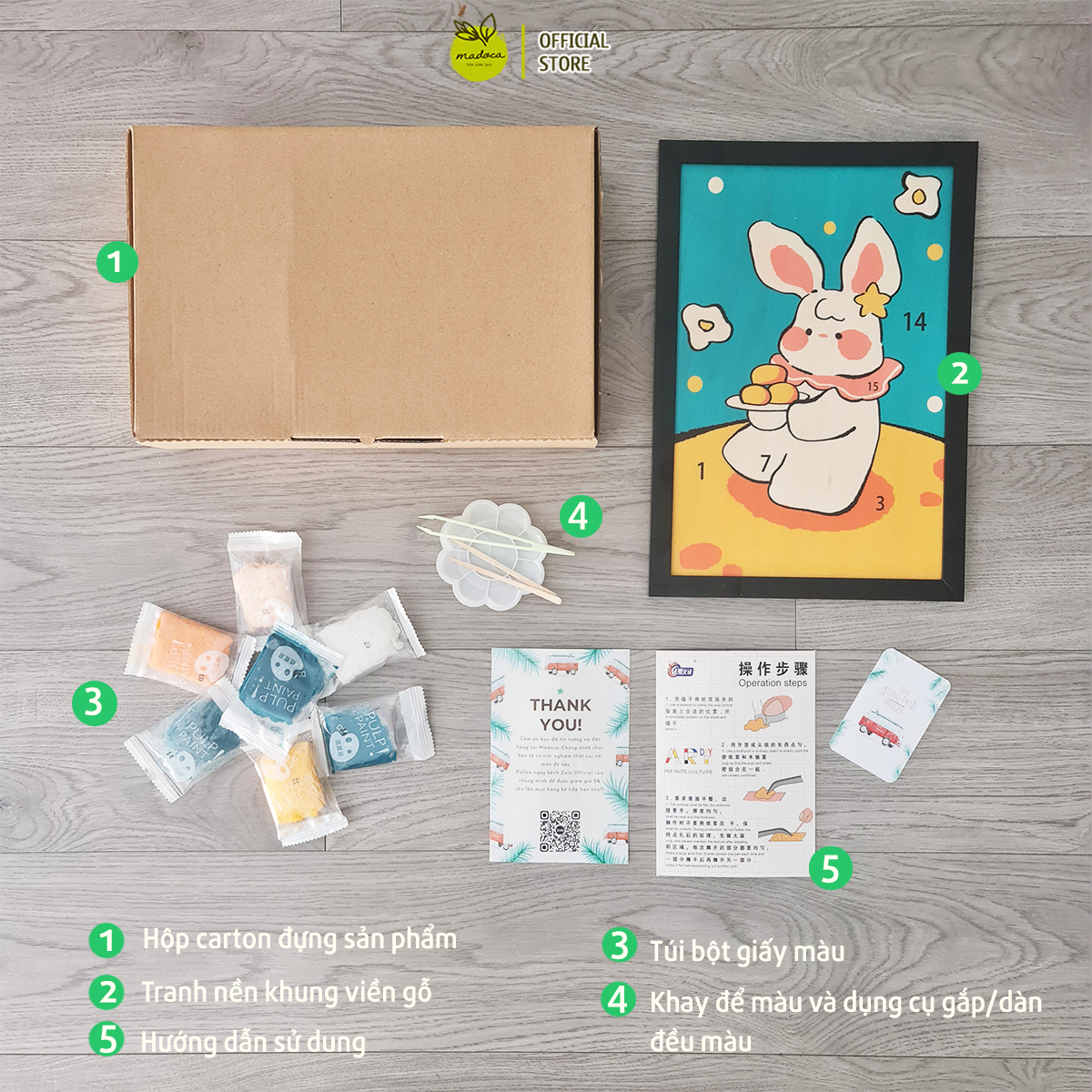 Bộ sản phẩm làm tranh bột giấy của Madoca: Tranh bột giấy ở tiệm sáng tạo Madoca có 02 kích thước A4 (21x29 cm) và A5 (14,8 x 21) với đầy đủ dụng cụ kèm theo: bột giấy trộn màu, trộn keo sẵn; khay đựng; tăm; kẹp nhíp; và cả nền tranh bằng gỗ đã được thiết kế hình ảnh đẹp mắt. Bạn có thể tuỳ ý lựa chọn hình ảnh mà mình yêu thích, bởi Tiệm có rất nhiều mẫu: Phong cảnh, động vật, đồ ăn,... Đặc biệt, tranh bột giấy của Madoca đã được viền khung chắc chắn, thiết kế dạng khung ảnh nên bạn hoàn toàn có thể sử dụng để trang trí bàn làm việc, phòng khách,... sau khi hoàn thành bức tranh.