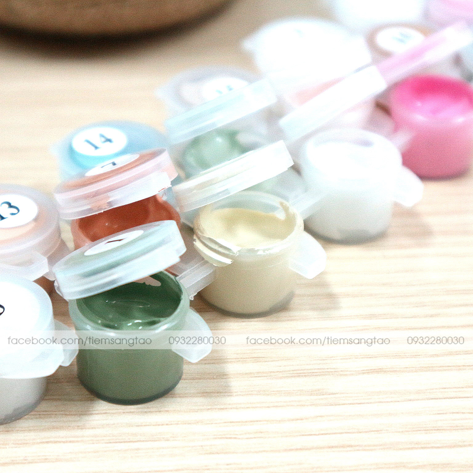 Bộ màu đều gồm những màu đã được pha sẵn, rất mịn mượt nên bạn chỉ cần chấm luôn từ lọ màu và tô lên tranh nhé. Tuy nhiên bạn vẫn nên chuẩn bị một cốc nước nhỏ để chấm thêm lên phần màu vừa tô giúp màu loang hơn và đẹp hơn, cốc nước này cũng giúp bạn rửa cọ sau khi tô xong từng màu, tránh lem từ màu cũ sang màu mới.
